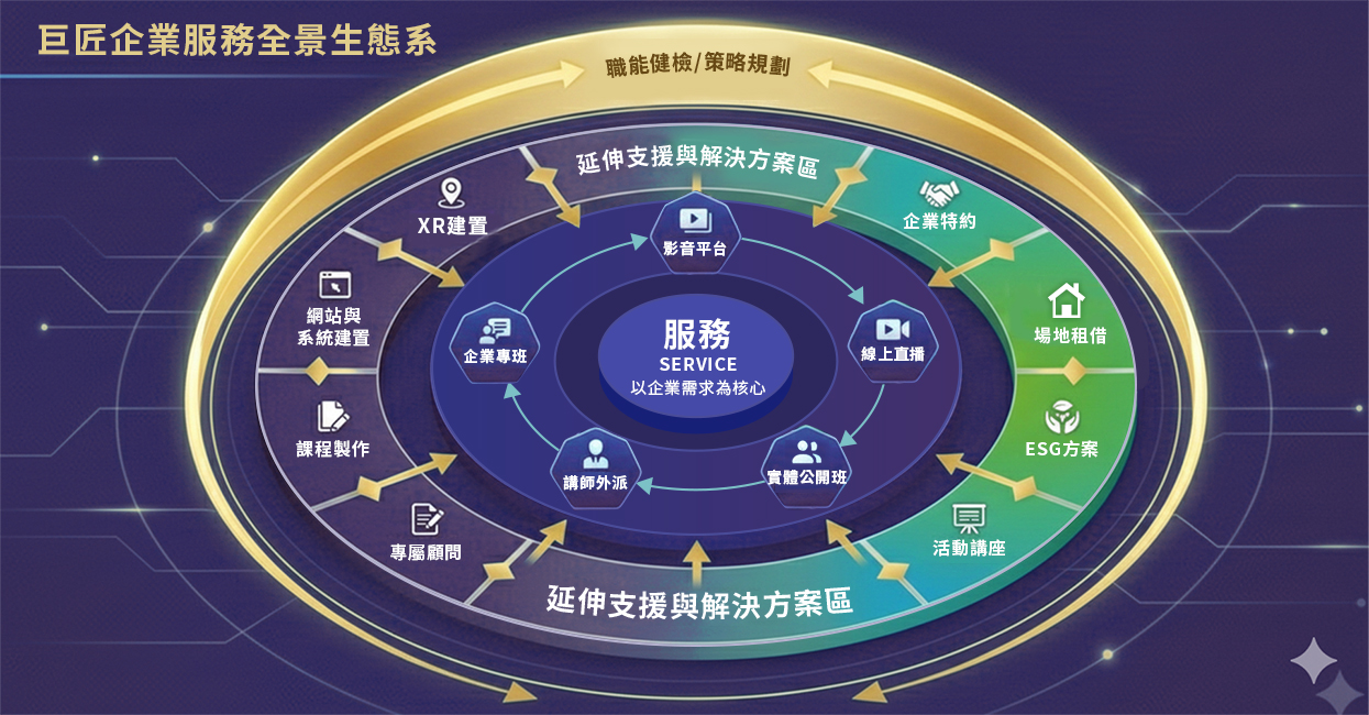 在 AI 驅動的競爭時代,企業需要的已不再是單點技能,而是能夠「看全局、懂工具、會跨域」,具備高度彈性與連結性的人才團隊。巨匠企業培訓的願景,是成為企業的人才策略引擎,協助您打造能持續成長的「人才韌性」。