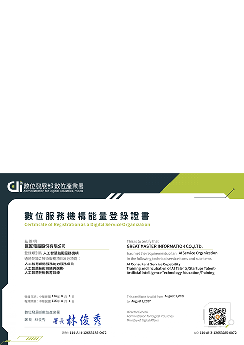 | 數位服務能量 | 數位發展部 數位產業署 | 數位服務機構能量登錄證書 |