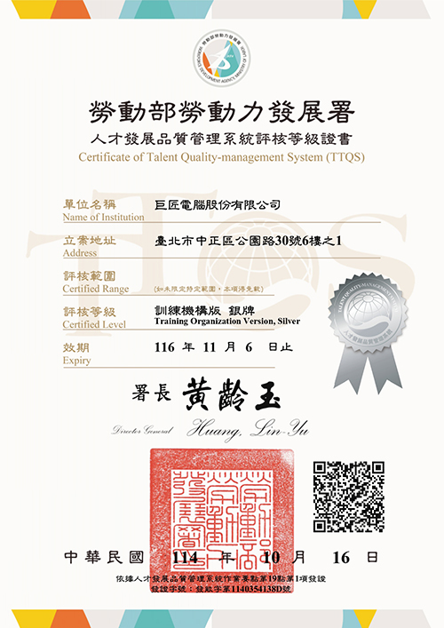 | 人才培訓品質 | 勞動部 勞動力發展署 | 人才發展品質管理系統 (TTQS) 銀牌 |